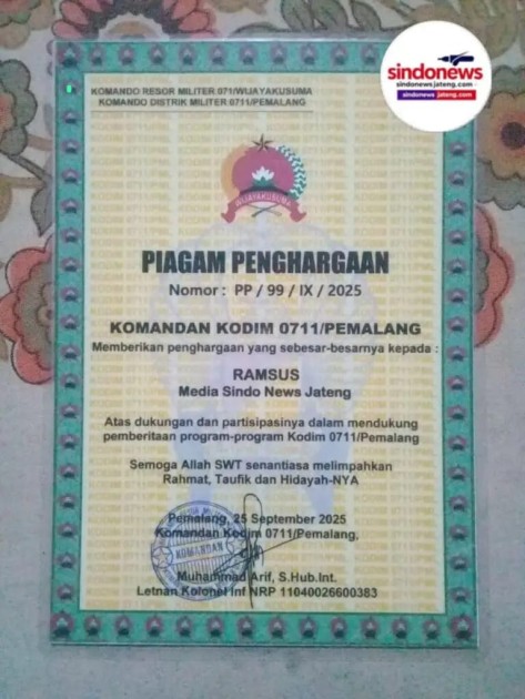 Penghargaan tersebut merupakan bentuk apresiasi dari Kodim 0711/Pemalang atas kontribusi dan dukungan media dalam mempublikasikan berbagai kegiatan serta program TNI di wilayah Kabupaten Pemalang. Piagam penghargaan bernomor PP/99/IX/2025 itu diserahkan secara langsung pada 25 September 2025 di Makodim 0711/Pemalang, dan ditandatangani oleh Dandim Letkol Inf Muhammad Arif, S.Hub.Int.