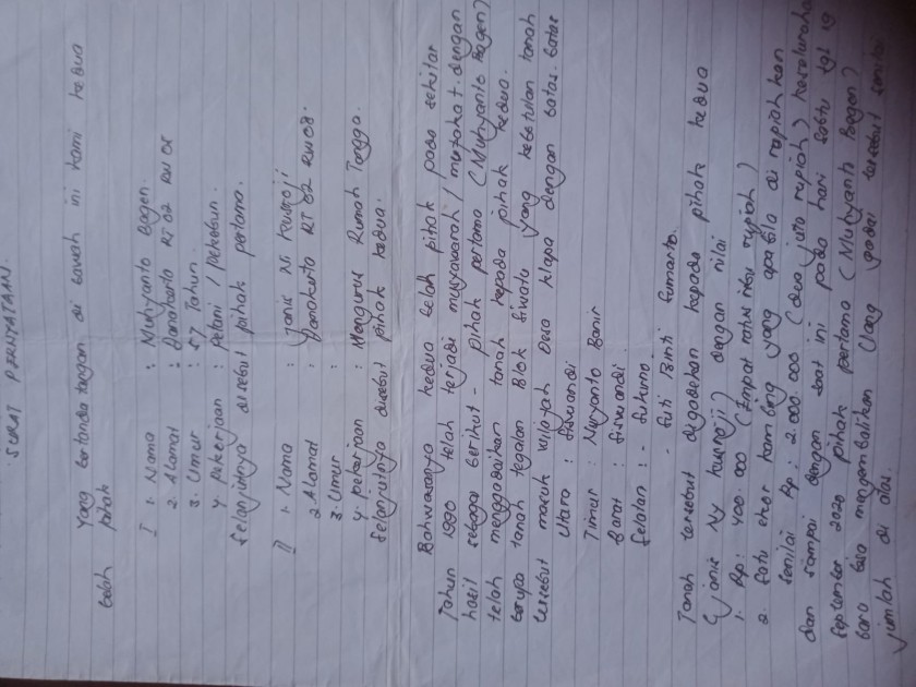 Kesepakatan tersebut kemudian dituangkan dalam surat pernyataan bermaterai yang disaksikan tujuh orang, terdiri dari perangkat desa dan pihak keluarga Janis. Setelah kewajiban dipenuhi, Muhyanto justru menemukan fakta bahwa tanah miliknya telah dibalik nama dan tercatat atas nama pihak lain. Proses tersebut diduga dilakukan tanpa persetujuan serta tanpa sepengetahuan dirinya sebagai pemilik sah.