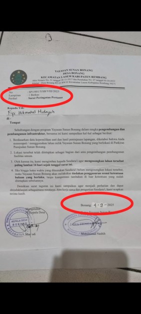 Yayasan Pasujudan Sunan Bonang berpegang pada penerbitan Surat Peringatan 1 sebagai dasar tindakan. Ketua Harian yayasan, Mas Odi, membenarkan bahwa ia menandatangani surat tersebut, namun mengaku terkejut melihat dokumen yang beredar karena terdapat coretan tipe-x yang tidak sesuai dengan naskah yang ia tanda tangani. Ia menyebut tidak menerima penjelasan detail saat diminta tanda tangan dan tidak menyimpan arsipnya. Odi juga menyampaikan bahwa seluruh arahan yang ia berikan sebelum pembongkaran diabaikan, termasuk keharusan berkomunikasi baik dengan pemilik, pemberian ganti rugi, serta larangan melibatkan aparat. Menurutnya, eksekusi juga dilakukan terlalu cepat karena prosedur ideal mewajibkan tahapan SP1 hingga SP3.