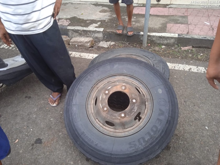 Peristiwa bermula ketika sopir mendengar suara tidak wajar dari arah belakang kendaraan. Pada awalnya, pengemudi belum menyadari kondisi tersebut dan hanya merasa terkejut. Situasi menjadi jelas setelah Paijo, petugas parkir di Toko Family Kampus, berteriak memperingatkan sopir bahwa salah satu ban telah terlepas.