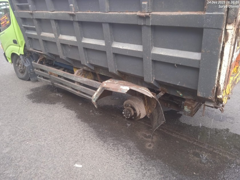Pengemudi kemudian berupaya menepikan kendaraan. Namun nahas, dua roda belakang kiri terlepas seluruhnya sehingga truk kehilangan keseimbangan dan ambrol tepat di depan Toko Family Kampus. Beruntung, kejadian tersebut tidak menimbulkan korban jiwa maupun kecelakaan lanjutan terhadap pengguna jalan lain.