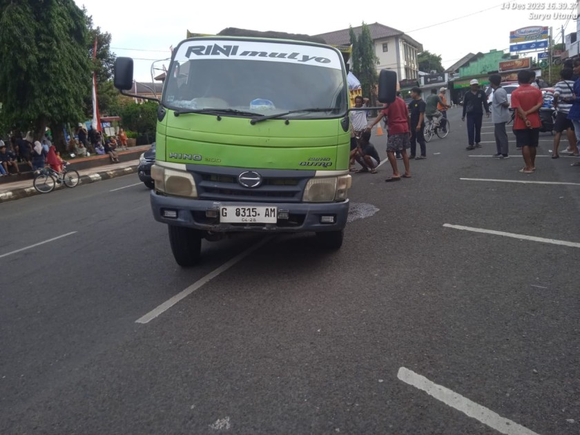 SUARA RAKYAT, Purbalingga 14/12/25 |  Sebuah truk pengangkut pasir bernomor polisi G-8315-AM mengalami kecelakaan tunggal di kawasan Alun-Alun Purbalingga, sekitar pukul 16.40 WIB tepatnya di depan Toko Family Kampus, pada hari ini, Minggu 14 Desember 2025. Truk tersebut dikemudikan oleh Febri dan dilaporkan mengalami insiden akibat lepasnya dua roda belakang sebelah kiri.